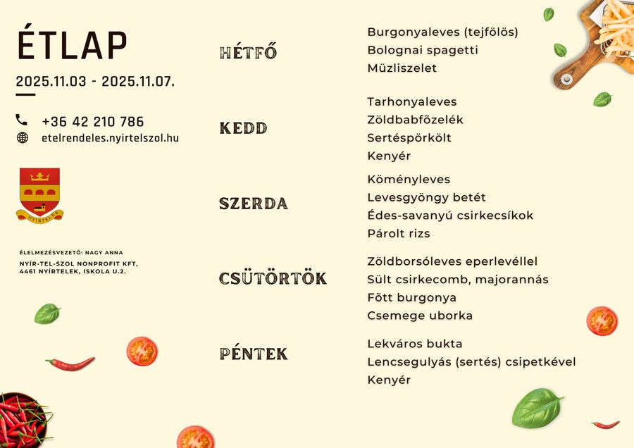 Ételrendelés+36 42/210-7864461 Nyírtelek, Iskola utca 2.